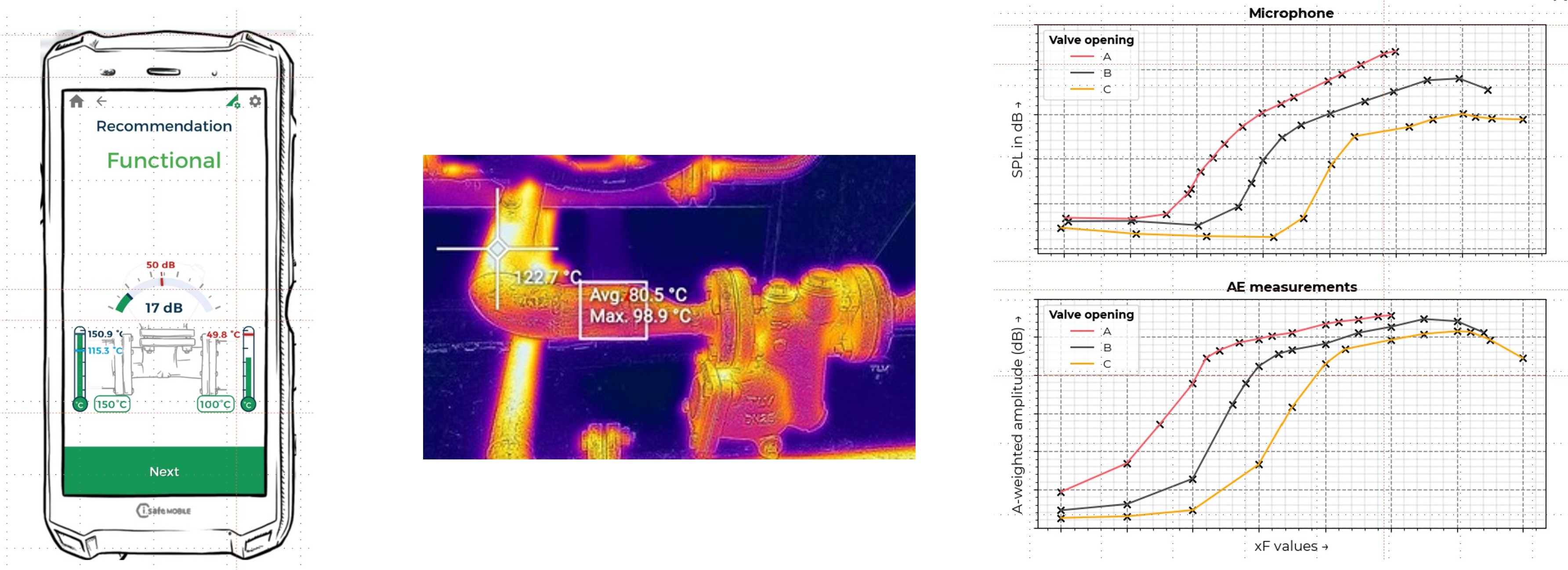 Conceptual image illustrating leak detection using acoustic measurements taken before, on, and after the valve.